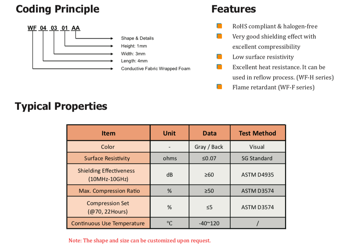 TMWF系列導電布包裹泡棉由高導電布、PU泡棉芯和導電壓敏丙烯酸粘合劑組成。這些高度可壓縮的材料專門設計用于提供卓越的EMI屏蔽和接地性能,并且可以提供優秀的防塵和防潮保護。WF系列產品極易調整尺寸,適用于計算機、智能手機、液晶顯示器和電信制造行業,如固定墊圈。" />